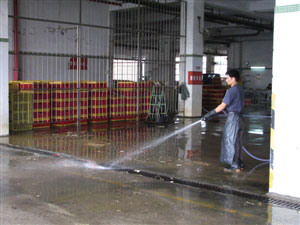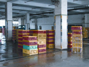 圖:工人清洗批發(fā)市場內(nèi)設施及使用過的膠籠。(圖片來源:澳門日報)