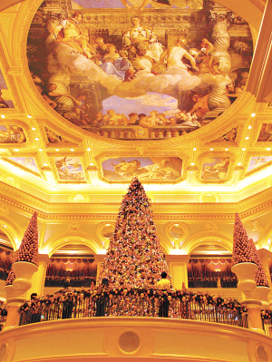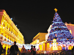 澳門的議事廳前地那一棵足有兩三層樓高的許愿樹燈飾會(huì)讓你眼前一亮,一層層藍(lán)盈盈小燈密密圍著,絲毫不會(huì)露出光裸電線,底下是制作頗為精細(xì)的大雪人,禮物堆,可愛(ài)得幾乎每個(gè)經(jīng)過(guò)的路人都忍不住要掏出手機(jī)去拍一張,小孩子更不用說(shuō)了,嚷嚷要媽媽放開(kāi)手好讓他爬上去拆禮物,看得人忍不住要會(huì)心微笑。然后郵政局門口那一棵許愿樹也十分華麗,而且是很別出心裁地“長(zhǎng)”在了大門口,叫進(jìn)出的人都覺(jué)得自己是在天使庇佑之下似的,忍不住要在心里許個(gè)小小愿望。即使是在普通的非鬧市區(qū),馬路上也掛上了串串燈飾,顯得氣氛特別濃。至于各大娛樂(lè)場(chǎng)所里面的許愿樹,更是一棵賽一棵的漂亮,一層樓高的是小意思,兩層樓高的是普通規(guī)模,最夸張的是威尼斯人度假村,幾乎每隔一段距離就有一棵或大或小的許愿樹,上面還很細(xì)心地掛滿了蝴蝶結(jié)、許愿球、小禮物、小襪子……看得人又忍不住要掏手機(jī)來(lái)玩自拍,不過(guò)即使一棵一張,估計(jì)即使是512M的卡都會(huì)不夠用呢。