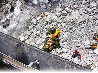 31日早上11時(shí)17分,一架編號(hào)為B-4125的直升機(jī)載著中尉彭兵等6名空降兵前去營(yíng)救。他們帶著兩天的干糧和水,從直升機(jī)索降到一塊狹小地帶,開(kāi)始搜尋受傷礦工。歷經(jīng)4個(gè)多小時(shí)搜尋,終于找到兩名受傷礦工,對(duì)他們進(jìn)行了消毒和簡(jiǎn)單包扎,并用擔(dān)架將他們抬到幾千米外直升機(jī)能夠營(yíng)救的地點(diǎn)。