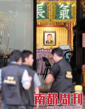在靈堂掛著的另一副更正式的挽聯(lián)是:“劍膽無畏,永不妥協(xié)!膘`堂祭奠的死者,新義安近年最“出位”的黑道頭目,拼殺20余年的李泰龍,最終在8月4日凌晨,在自己的地盤尖沙咀,被仇家有計(jì)劃地?cái)貧ⅰ6潭?0秒的車撞、刀砍,曾經(jīng)傷人無數(shù)的他,最終血噴街頭而終,震撼香港。