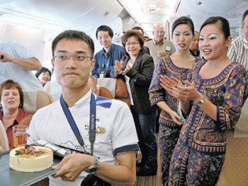 根據(jù)新加坡航空資料,約有10多名港人成為A380首航的見證人,當中包括獨自登上航機的年輕人Francis Wu。昨日度過22歲生辰的Francis,正忙于以手提電腦輸入日志時,機組人員神秘地捧蛋糕走近,為他慶祝。其它乘客亦加入慶祝行列,一同拍掌唱生日歌,空姐亦特別送上生日卡,難怪Francis說:“今次是他人生中最好的一個生日!痹诿绹f金山City College修讀計算機科技的Francis表示,數(shù)月前父母問他今年希望收到什么生日禮物時,他說希望可乘坐A380的首航,于是父母以1250美元(約9750港元)為他投得機票。