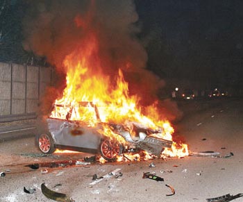 司機(jī)陳某被懷疑沒(méi)有扣好安全帶而導(dǎo)致其彈出車外,重傷昏迷倒臥在跑車對(duì)開(kāi)三公尺處,車頭隨即冒煙起火,全車迅即陷入火海。其它駕駛者路過(guò)看見(jiàn)這一幕停車察看,但害怕跑車發(fā)生爆炸,報(bào)了警卻不敢走近,各人焦慮地圍觀,等待救援人員到場(chǎng)。
