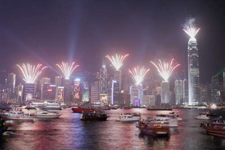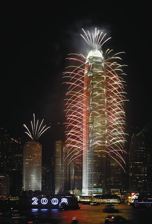 二十三時五十九分,行政長官曾蔭權在尖沙嘴文化中心啟動倒計時儀式。二00七年的最后二十秒,國金二期北面外墻兩側由三十二層起依次向上燃放焰火,火樹銀花照耀整個維港;合和中心、AIG大廈、長江集團中心及東企業(yè)廣場四棟大廈,外墻同時顯示倒計時時間,停泊在維港的滅火輪則向海面噴射多樣的水花……