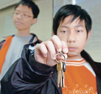 香港小六學生李思文(右)平均每天獨留在家7小時,父母規(guī)定他要將家門鑰匙掛在身上,以免遺失。同樣要經(jīng)常在家獨處的李東陽(左)就將門鑰匙放在褲袋。(圖片來源:明報)