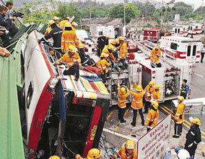 中新網(wǎng)5月6日電 據(jù)香港文匯報報道,上周四(5月1日)在香港西貢南邊圍回旋處釀成18死44傷的旅游巴翻側(cè)大車禍,一名于北區(qū)醫(yī)院留醫(yī)的45歲女傷者,經(jīng)5天搶救后延至5日終告?zhèn)夭恢危畲筌嚨溗勒咴鲋?9人。