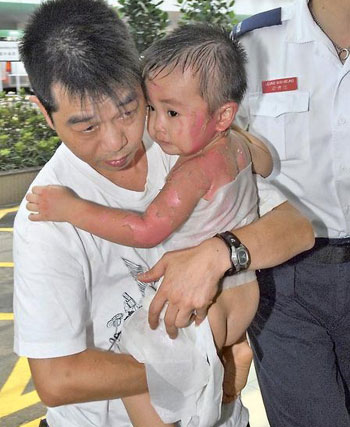 慘被熱湯灼傷的男童姓洪(譯音),1歲半大,與家人居于葵涌一單位,父母約30多歲。男童送院時在父親懷中不斷嚎哭,全身赤裸但敷上保護膜,其背部、左前臂及左臉頰全部紅腫,大幅表皮脫落,露出粉紅嫩肉,據悉約有三成半皮膚被灼傷,狀況令人慘不忍睹。