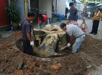 由于樹干直徑粗近兩尺,工人要鋸成片狀,再寫上編號運走,等待日后重組樹型追查被侵蝕和倒塌原因。部分樹干的中央位置被蟲蛀出現(xiàn)“空心”,大量類似螞蟻的昆蟲因巢穴被毀爬行而出。