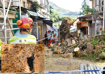 塌樹意外發(fā)生后,有關(guān)單位實時封閉該段赤柱大街,康文署工人通宵將倒下大樹鋸散移走,不過因連理的另一棵大樹也有倒塌危險,工人28日先將樹冠枝葉鋸掉,再綁上繩索固定樹身,由上而下逐步鋸斷樹干,整個砍伐過程直至28日下午2時才能完成。