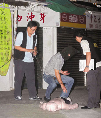 晚上7時(shí)45分,另一名身高穿灰黑色間條T恤及牛仔褲、身高約6尺的疑犯,也被重案組探員以黑頭套蒙頭,及帶同一個(gè)假人押回現(xiàn)場(chǎng),在案發(fā)小店對(duì)面空地重組案情。其間疑犯曾以拳頭向假人作襲擊狀,探員則在旁錄像,一行人逗留約半小時(shí)才離去。