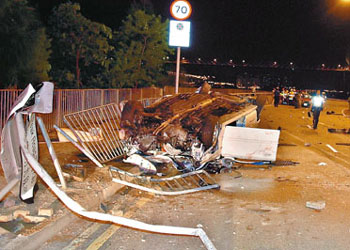 至21日凌晨零時(shí)27分,亡命飛車駛至深井青山公路,爬頭欲超越前面的士,但車頭撞上的士左尾部,全車失控鏟上路中安全島,反彈狂撞左邊行人路和路牌,全車反轉(zhuǎn)四輪朝天,車頂壓扁,前后擋風(fēng)爆裂,四個(gè)車輪撞至彎曲,車內(nèi)兩人頭爆重傷被困。被撞的士則向前沖出30米,打轉(zhuǎn)掉頭才停下,車內(nèi)司機(jī)和兩名女乘客同告頭頸受傷被困。