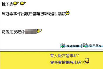 年初的陳冠希艷照門事件引起社會嘩然,各界關(guān)注網(wǎng)上色情資訊的監(jiān)察問題。香港互聯(lián)網(wǎng)協(xié)會主席莫乃光說,會方曾向?qū)W生派發(fā)互聯(lián)網(wǎng)使用守則,但一般網(wǎng)民的行為則難以控制:“其實(shí)陳冠希事件前后,網(wǎng)上一直都有性愛片段流傳,重點(diǎn)是有沒有人因此受害!彼f,所謂淫褻資訊的監(jiān)察,存在基本上的困難,因?yàn)槟承┚W(wǎng)上論壇的成立,根本就是以成人話題為主,很難要求主持人刪去這些資訊。