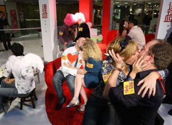 在鎂光燈的閃爍下,五對(duì)來(lái)自不同國(guó)家的情侶,坐上獨(dú)特的“愛情連椅”,他們要在眾目睽睽下,用各異的方式吻自己的愛侶,持續(xù)2分14秒。圍觀市民大感興趣,摒住呼吸觀賞現(xiàn)場(chǎng)的熱吻。