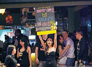 金融海嘯令香港酒吧生意一落千丈,美國軍艦這次訪港,預計會帶旺尖沙咀、灣仔及銅鑼灣一帶的消費,特別為區(qū)內(nèi)的酒吧帶來“及時雨”。不少酒吧東主得悉有大批美軍抵港,如久旱逢甘露,有酒吧更在門外掛上美國國旗作招徠,而大批衣著性感女郎,比平時更早“開工”,未及黃昏已經(jīng)在街頭向途經(jīng)大兵拋媚眼。