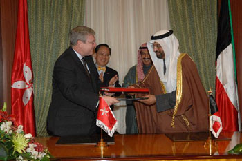 據(jù)特區(qū)政府網(wǎng)站消息,行政長官曾蔭權(quán)27日早上與科威特首相納賽爾˙薩巴赫共同見證香港駐布魯塞爾歐洲共同體代表柏志高與科威特商貿(mào)部長Sheikh Falah Al Hajiri簽署意向書。