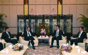 中新網3月18日電 據澳門日報報道,澳門特別行政區(qū)行政長官何厚鏵17日晚在北京釣魚臺山莊華天酒店與湖南省委書記張春賢、湖南省長周強會面。張春賢感謝澳門特區(qū)政府、澳門同胞對湖南抗冰救災期間的支持。