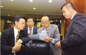 鄭志強與立法會顧問探討法案行文。(圖片來源:澳門日報)