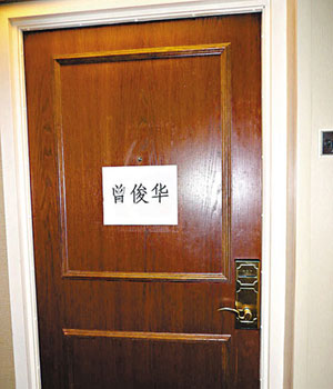 曾俊華在華盛頓獲安排隨國家代表團(tuán)其它成員入住萬豪Wardman Park酒店9樓,與國務(wù)院副總理王岐山、人民銀行行長周小川,其它參與會議的部長及中國駐美大使周文重夫婦等同一樓層。為了方便各成員易于識別房間的住客,門外都貼上團(tuán)員名字。