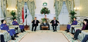 何厚鏵在晚宴前會見了代表團一行,國家載人航天工程贈送“神舟七號”載人飛船模型給特區(qū)政府,何厚鏵代表特區(qū)政府贈送金蓮花擺設(shè)給代表團。