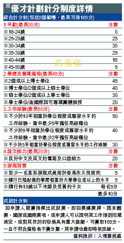 香港入境處在六月二十八日公布優(yōu)才計劃的計分方法并即日接受申請。符合“基本資格”所有條件的申請人,可選擇以“綜合計分制”或“成就計分制”接受進一步評核。每名申請人只能在同一時間提交一份申請,并只能在同一次申請中選擇以一種計分制進行評核!