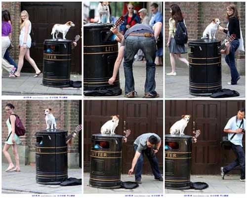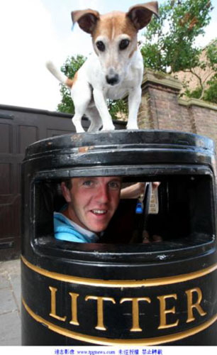中新網(wǎng)7月8日電 據(jù)臺(tái)灣“今日新聞網(wǎng)”7日?qǐng)?bào)道,英國一位知名的街頭藝人查理卡維(Charlie Cavey)總是躲在垃圾桶里自彈自唱。但這種表演方式行動(dòng)不便,賞金時(shí)常被偷走或搶走,于是最近找來一只杰克羅素犬“歐比”(Obi)幫他把風(fēng)。歐比乖巧的模樣,令人聯(lián)想到在唱片上有超過100年歷史的知名LOGO。