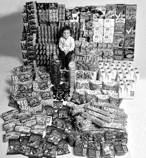 12日,英國媒體刊登了一份英國食品標準機構和營養(yǎng)調查機構共同統(tǒng)計的數(shù)據(jù),數(shù)據(jù)統(tǒng)計了4到10歲兒童平均每人一年內所食用的包括蛋糕、冰激凌等在內的“垃圾食品”的數(shù)量,并將所有這些放在一起拍了張照片。據(jù)統(tǒng)計每名兒童一年平均吃5840克餅干、8030克蛋糕、4380克奶酪、5840克冰激凌等。(綜合)