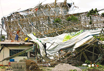 菲律賓群島位于西太平洋,平均每年遭受臺風(fēng)和熱帶風(fēng)暴襲擊20多次,去年風(fēng)災(zāi)造成43.8億美元經(jīng)濟(jì)損失。2009年9月底和10月,熱帶風(fēng)暴凱薩娜和臺風(fēng)芭瑪相繼吹襲菲律賓,引發(fā)嚴(yán)重洪災(zāi)和山體滑坡,造成約1000人死亡。