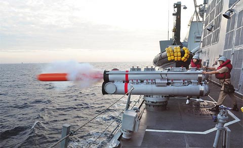 據(jù)報道,反潛攻擊演習在韓國江原道江陵、巨津東側海域舉行,以25日和26日的反潛探測演習為基礎,當天實施了攻擊已被探測的潛艇的演習。韓國軍方相關人士說:“4500噸級韓國型驅逐艦(KDX-Ⅱ)‘崔瑩’號向假想潛艇發(fā)射了韓國產(chǎn)輕魚雷‘青鯊’。‘崔瑩’號憑借魚雷誘餌系統(tǒng)(TACM)避開敵方魚雷后,向周邊艦艇下達了攻擊潛艇的命令。”