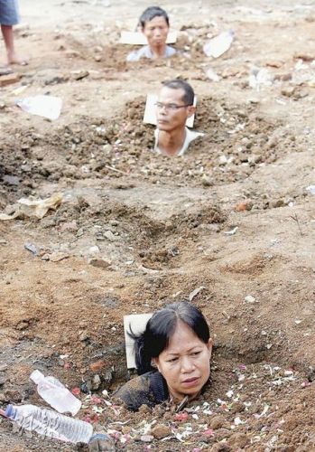 中新網(wǎng)8月3日電 據(jù)《明報(bào)》報(bào)道,印度尼西亞雅加達(dá)一個貧民窟的居民,2日將自己埋入泥土,僅伸出頭部,以抗議政府強(qiáng)行拆遷。