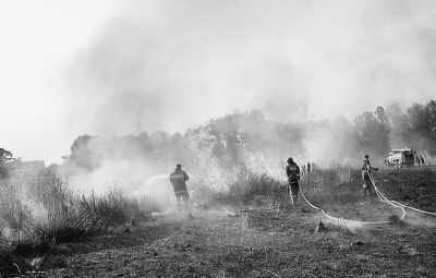 波塔波夫的話很快得到了驗(yàn)證。就在記者返回途中,距莫斯科大約15公里處,路邊一個加油站附近起火。這個加油站南側(cè)有一道大約10米寬的隔離帶,再往外則是一個比足球場還大的草場,草場的東、西、南三面是森林。記者看到,100多米長的火龍借著風(fēng)力向加油站方向翻滾而來。過火之處,留下黑乎乎的灰燼。加油站的職工用提水桶和臉盆盛著水往草場飛奔。