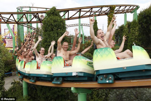 中新網(wǎng)8月9日電 據(jù)英國媒體報道,當(dāng)?shù)貢r間8月8日,102名英國男女齊聚艾塞克斯郡冒險島游樂園,將衣服全部脫掉,體驗裸體乘坐“綠色尖叫”過山車的刺激感覺。這102人也創(chuàng)造了一項新的世界紀(jì)錄。
