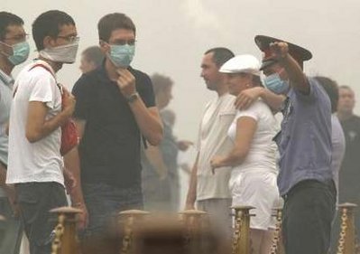 根據(jù)環(huán)保單位的檢測(cè),莫斯科空氣污染的程度,已經(jīng)超出正常值三倍,氣象預(yù)測(cè)說這個(gè)禮拜狀況應(yīng)該會(huì)改善。嚴(yán)重的霾害,也影響航空交通,星期天,因?yàn)槟芤姸忍,莫斯科各機(jī)場(chǎng)總共有九十多架航班延誤或是停飛。