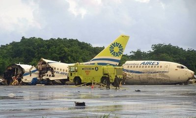 客機上共搭載125名乘客和6名機組人員?蜋C是當地時間15日晚從哥倫比亞首都波哥大起飛的。當地航空部門官員稱,客機駕駛員盡力避免飛機與機場跑道直接相撞。