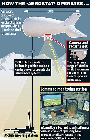 這種氣球裝設(shè)有攝像頭和雷達(dá),在18英里外就能對(duì)敵軍的手機(jī)、無(wú)線(xiàn)電進(jìn)行監(jiān)聽(tīng),并拍攝6英里外的影像。氣球不分晝夜地將敵方活動(dòng)的實(shí)時(shí)聲音、畫(huà)面通過(guò)安全系統(tǒng)發(fā)送到由英國(guó)情報(bào)機(jī)構(gòu)軍人組成的輕型電子戰(zhàn)小組(LEWT)監(jiān)控基站,再進(jìn)一步送到阿富汗英軍基地,或傳回位于英格蘭西南部城市切爾滕納姆的國(guó)家通信總局監(jiān)聽(tīng)中心,供工作人員將信息與之前獲得的塔利班成員資料相對(duì)比,以判斷其具體身份。
