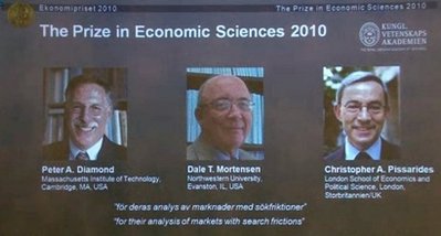 中新網10月11日電 據外電報道,瑞典皇家學院11日宣布,美國經濟學家彼得·戴蒙德(Peter A. Diamond)、戴爾·默藤森(Dale T. Mortensen),塞浦路斯裔、英籍經濟學家克里斯托弗·皮薩里德斯(Christopher A. Pissarides)三位學者共同獲得2010年諾貝爾經濟學獎。