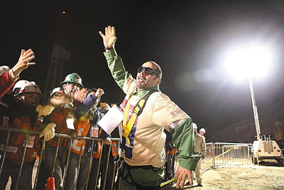 第2名被救出的礦工馬里奧無疑是最激情四射的一位。馬里奧在快要到達(dá)井口時就開始與地面上的礦友喊起了玩笑話,聲音洪亮,充滿激情。在成功升井之后,馬里奧表情輕松的走下救生艙,與家人擁抱。他把含有金粒的礦石遞給救援人員表示感謝。