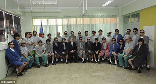 中新網(wǎng)10月15日電 據(jù)外電報道,戴著護視鏡,身著醫(yī)用長袍,33名智利礦工獲救后在醫(yī)院團聚,拍下了他們重見天日后的首張集體照。