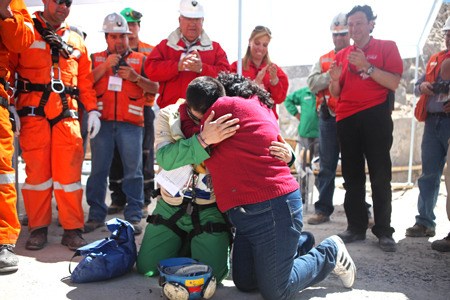 16日,智利科皮亞波,獲救礦工與親人擁抱。被困礦井2個(gè)多月的33名智利礦工奇跡獲救,他們在家鄉(xiāng)享受著英雄般的待遇。