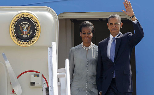 報(bào)道稱,奧巴馬乘坐的“空軍一號”專機(jī)于當(dāng)?shù)貢r(shí)間中午12時(shí)50分左右降落孟買國際機(jī)場。美國總統(tǒng)和第一夫人走出機(jī)艙向迎接的美印兩國政要招手致意。