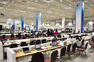 峰會(huì)會(huì)場COEX的新聞中心面積空前,主要分為電視和文字圖片記者兩個(gè)區(qū)域。工作人員表示,新聞中心設(shè)置1330個(gè)記者座位,另有132個(gè)電視轉(zhuǎn)播亭。