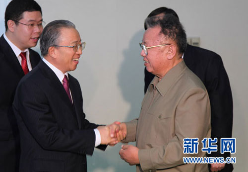 朝鮮勞動(dòng)黨總書記、國(guó)防委員會(huì)委員長(zhǎng)金正日9日在平壤會(huì)見了國(guó)務(wù)委員戴秉國(guó)。