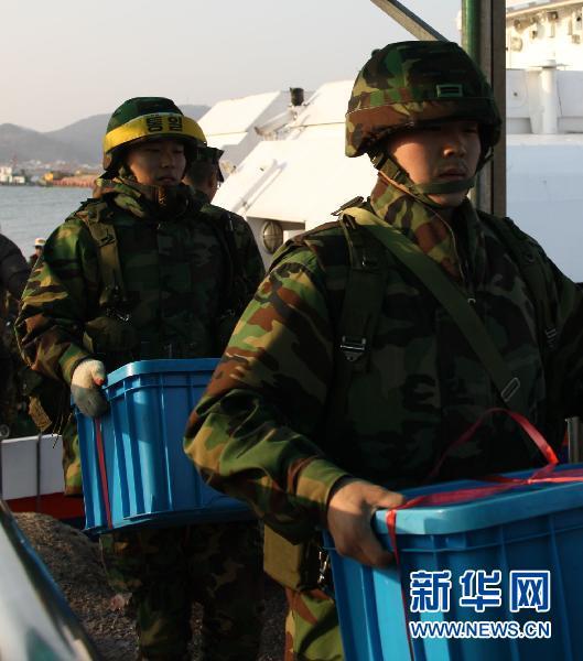 12月18日,在韓國(guó)延坪島港口,韓國(guó)海軍陸戰(zhàn)隊(duì)員搬運(yùn)物資。韓國(guó)軍方16日宣布,韓國(guó)海軍將于本月18日至21日期間的某一天在延坪島海域舉行海上實(shí)彈射擊訓(xùn)練。這一計(jì)劃令延坪島居民深感憂慮。 新華社記者 何璐璐 攝