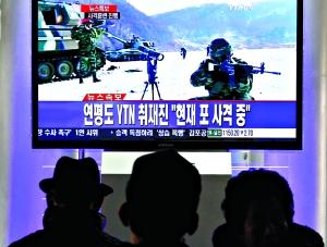 韓國各界對軍方舉行射擊訓(xùn)練的消息十分關(guān)注。街頭公共電視屏幕前擠滿了觀眾。