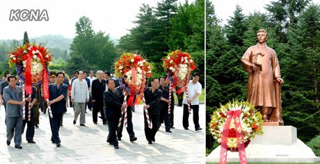 金正恩送來的花圈,擺放在金亨稷銅像和墳?zāi)骨。朝鮮勞動黨中央委員會政治局常委金永南、崔永林、崔龍海,以及朝鮮各級領(lǐng)導(dǎo)干部、人民軍官兵、群眾和青年學(xué)生參加敬獻(xiàn)花圈儀式。