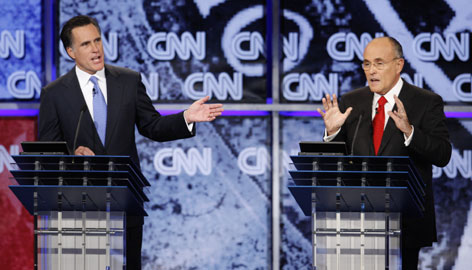 中新網11月30日電 美國共和黨總統(tǒng)參選人羅姆尼和朱利安尼29日在該黨競選辯論中情緒失控,兩人就非法移民問題相互猛烈抨擊。這種憤怒的人身攻擊再次顯示,共和黨內競爭極端激烈的提名戰(zhàn)正不斷升高緊張程度。此時距2008年大選第一場提名戰(zhàn)僅35天,那就是依阿華州的黨團會議。