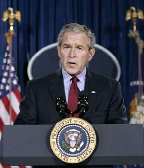 中新網(wǎng)12月28日電 據(jù)法新社報道,巴基斯坦前總理貝-布托27日在競選集會上遭到炸彈襲擊,不治身亡。圖為布什譴責貝-布托遇刺事件。(關新)