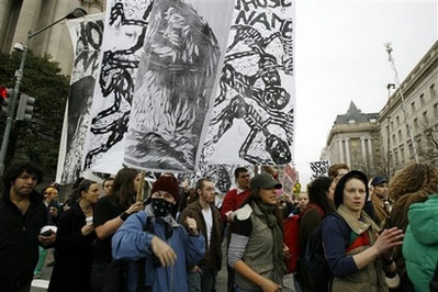 華盛頓的示威者打算“封鎖”國(guó)家稅務(wù)局,另一些示威者則會(huì)設(shè)法阻止K街的“發(fā)戰(zhàn)爭(zhēng)財(cái)者”。K街是華盛頓公司游說者的大本營(yíng)。