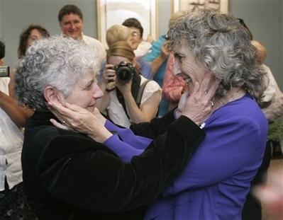 16日,一對共同生活了34年的女同性戀人在加州合法結(jié)婚。