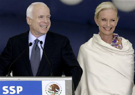 7月3日,美國共和黨總統(tǒng)候選人麥凱恩同妻子辛迪出席在墨西哥城的一個(gè)新聞發(fā)布會(huì)。