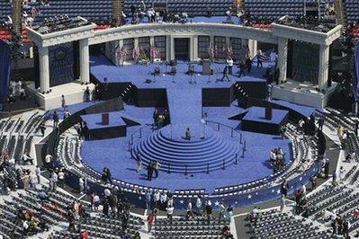 奧巴馬發(fā)表演說(shuō)前,女演員Jennifer Hudson將演唱國(guó)歌,還有繞舌歌手will.i.am、歌手Sheryl Crow等演唱,星光熠熠。當(dāng)奧巴馬出場(chǎng)時(shí),臺(tái)上將大灑彩紙,并圍繞球場(chǎng)四周放煙花。