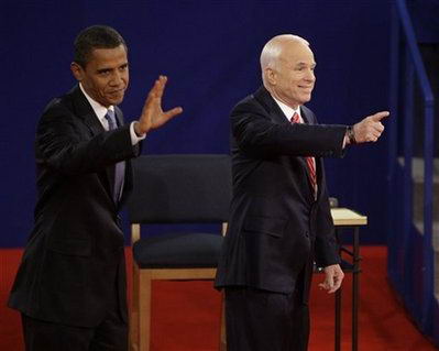 據(jù)美聯(lián)社報道,美國當?shù)貢r間10月7日晚上21點左右(北京時間10月8日早上9點左右),美國共和黨總統(tǒng)候選人麥凱恩和民主黨總統(tǒng)候選人奧巴馬在田納西州的貝爾蒙特大學開始辯論,這是兩人選舉議程的三場辯論中的第二場辯論。